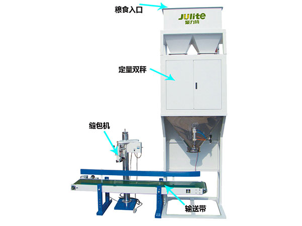 設(shè)定包裝范圍后,物料由給料機(jī)構(gòu)加入稱(chēng)量斗,控制器收到傳感器的重量信號(hào)后,按預(yù)先設(shè)定的程序值進(jìn)行控制,開(kāi)啟加料門(mén)進(jìn)行給料;當(dāng)達(dá)到設(shè)定的范圍,給料機(jī)構(gòu)停止給料,開(kāi)始另一個(gè)秤體的給料。自動(dòng)振袋后,觸動(dòng)行程開(kāi)關(guān),物料袋自動(dòng)松開(kāi)落入輸送帶上,被送到縫包機(jī)完成縫包。